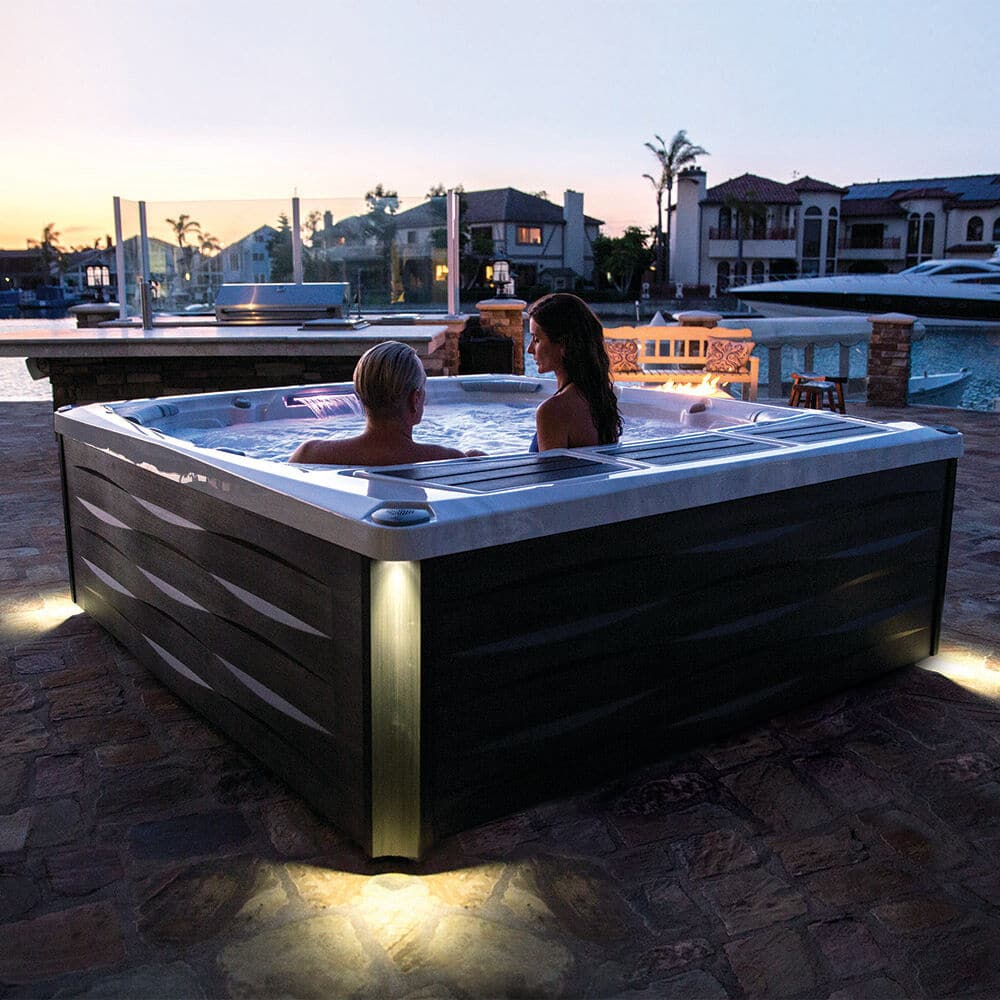 The crisp, rhythmic texture of the exterior cabinetry highlighted by corner illumination adds a whimsical combination of classic beauty and architectural form. And a low-profile flat top rail and beautiful lounge deck with illuminated SunCooler™ cold storage areas offer additional seating and convenience. Throughout the Kingston™ you can melt away stress and strain in seats that feature popular combinations of our Patented Fluidix® Jets. Wide seats inspired by some of our most popular models are highlighted by the even glow of LED lighting, adding beauty and safety. Greeting muscles with the widest back and leg coverage we’ve ever offered and soothing your muscles and senses with specialty Silent Air® injector jets and SunScents® Aromatherapy, total relaxation is only as far away as your backyard.